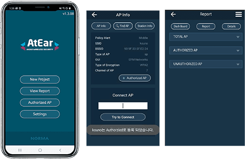 AtEar는 ISMS, ISO27001 무선보안 가이드라인에 준하여 무선네트워크의 취약점을 분석, 점검하고 최적화된 보고서를 제공합니다.