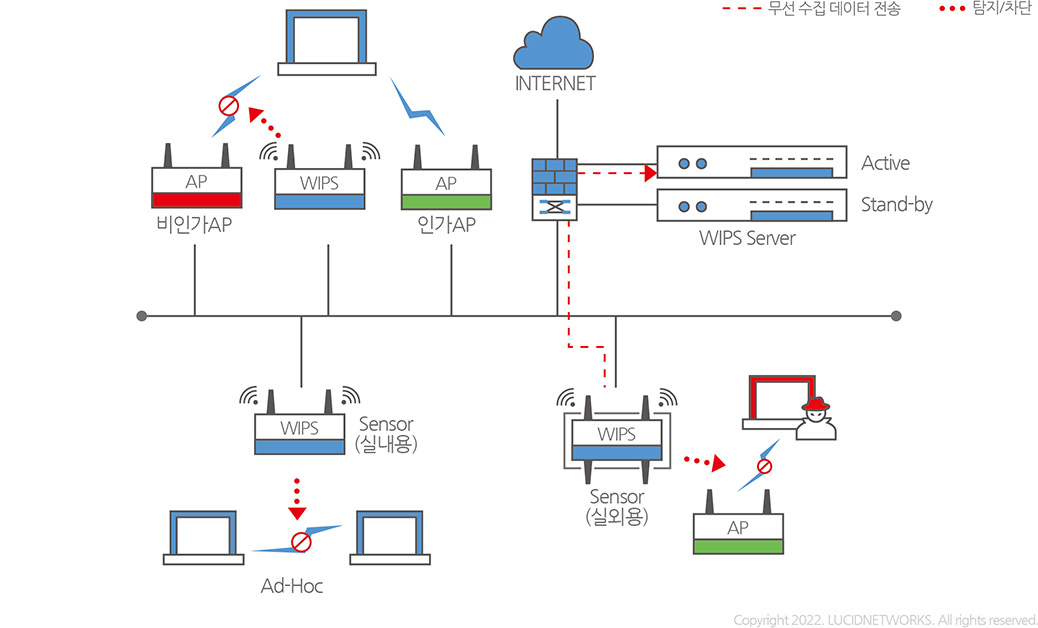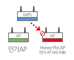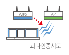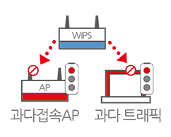WIPS는 WLAN 표준을 준수하는 모든 무선장비에 대한 모니터링을 통해 내외부로부터 발생할 수 있는 각종 보안취약점을 탐지·차단하여 내부 네트워크를 보호합니다.